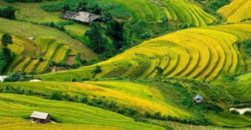 Hình ảnh cuộc sống bình yên trên cánh đồng thửa ruộng bậc thang trập trùng.