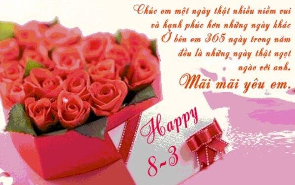 3. Người yêu của anh à! anh đã nhớ rằng có lần anh nói với em rằng anh sẽ là người đem đến cho em nhiều niềm vui ở trong cuộc sống này, nhưng chắc chắn rồi điều đấy sẽ không bao giờ thay đổi. Và anh chỉ mong ước thêm một điều, mỗi ngày trôi qua đều là một ngày lễ 8/3 thật đẹp đối với em. Yêu em nhiều.