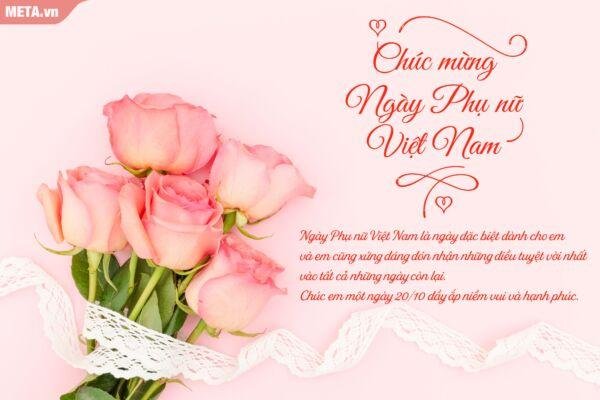 5. Ngày 20/10 đã đến, chúc cho chị em phụ nữ tại đất nước Việt Nam thoát khỏi những muộn phiền và lo lắng trong cuộc sống. Thay vào đó là sự vui vẻ, yêu đời và gặp nhiều may mắn ở trong cuộc sống cũng như thuận tiện mọi việc trong sự nghiệp.