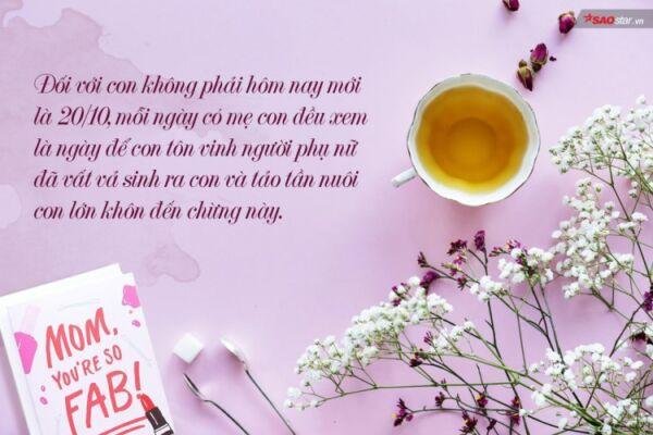 2. 20/10 con chúc người phụ nữ quan trọng nhất cuộc đời con sức khỏe và nhiều niềm vui trong cuộc sống. Con yêu mẹ.